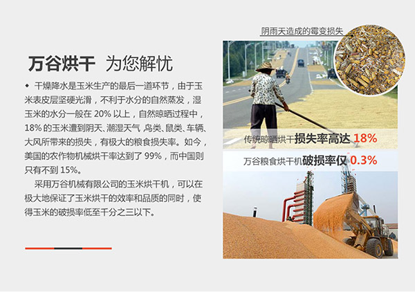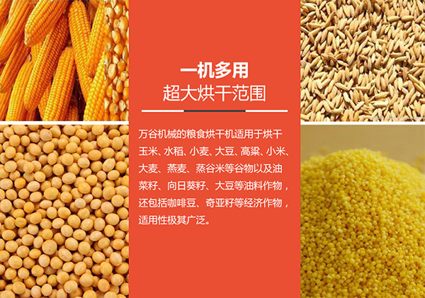 鄭州萬(wàn)谷機(jī)械的糧食烘干機(jī)吸收國(guó)外先進(jìn)機(jī)型的優(yōu)點(diǎn)、并基于我們多年的設(shè)計(jì)生產(chǎn)制造經(jīng)驗(yàn)以及結(jié)合全國(guó)各地區(qū)不同緯度、濕度情況下定制化創(chuàng)新研制而成。糧食烘干機(jī)依據(jù)用戶的實(shí)際需求的不同針對(duì)性的采用混流、順流、順逆流等多種形式的糧食烘干工藝,萬(wàn)谷糧食烘干機(jī)對(duì)用戶量身打造,提供定制化的全程解決方案,解決用戶糧食烘干的后顧之憂。萬(wàn)谷糧食烘干機(jī)對(duì)糧食品種、氣候環(huán)境的適應(yīng)性很強(qiáng),可用于烘干玉米、水稻、大豆、小麥、高粱、油菜籽等各類谷物和油料作物。萬(wàn)谷糧食烘干機(jī)使用干凈熱空氣作熱介質(zhì),即熱風(fēng)烘干,熱源以燃煤、燃油、天然氣、秸稈、稻殼等為燃料的熱風(fēng)爐,也可以蒸汽為熱源。鄭州萬(wàn)谷糧食烘干機(jī)的烘干方式為連續(xù)式烘干作業(yè),烘干效率高、自動(dòng)化智能化程度高,可露天安裝使用,適合在各糧庫(kù)及糧油加工廠等場(chǎng)合使用。