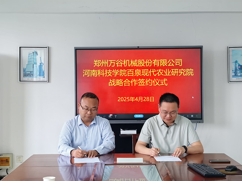 劉潤強教授與公司專項課題負責人及研發團隊就專項進行了充分研討交流,雙方各自通報了課題實施進展情況,并對課題間的創新協作以及未來校企合作規劃深入溝通交流。隨后雙方一致同意達成校企戰略合作關系,劉潤強教授和公司負責人共同簽署了河南科技學院百泉現代農業研究院與鄭州萬谷機械股份有限公司戰略合作協議。雙方將在科技創新、人才培養以及成果轉化等方面實現資源共享和共同發展。